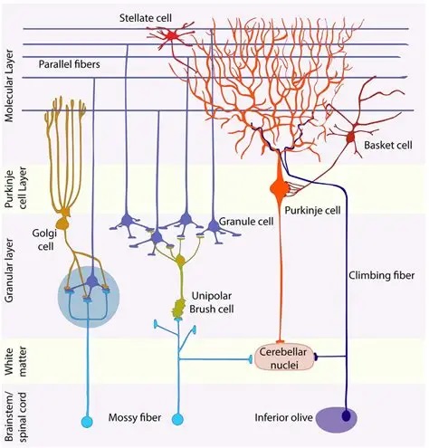 Even though synaptic matrices are very useful computationally, the picture of linear integration along dendrites is far too simplistic from a biological standpoint. Purkinje cells are multistable, they have multiple subthreshold stable states and their dendrites also generate small action potentials ("dendritic mini-spikes"), and these program the spike output in some highly nonlinear ways. We will return to look at the cerebellum in considerable detail when we talk about eye movements and the oculomotor system. For now the figure is meant to show the regular architecture and the topographic organization of some internal delay networks.