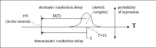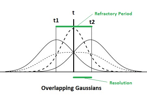 The ability to precisely discriminate time is enabled by the Gaussian shape of the connections between the delay line and the output neurons. This geometry is primarily determined by the shape of the dendritic trees of the output neurons. A sum-of-Gaussians operations helps to precisely localize the peak within the population. It is intuitive that in this kind of arrangement, there should be more neurons signaling actual time, than there are sampling points along the timeline. The architecture is such that there are never any "abruptly changing signals" from one moment to the next, once a nerve impulse has entered the timeline it never suddenly disappears, the axon never fails to conduct and never generates any spurious impulses. The figure shows a simple timeline that will give us 10 times better resolution than the refractory period of the individual neurons. In this network each output neuron represents a specific location in space, the one that fires determines where the sound is.