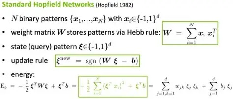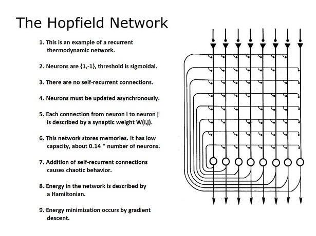 It is worth re-emphasizing, that this network doesn't work at all unless the updates are independent and asynchronous. This network therefore operates quite differently from the back-propagation paradigm in machine learning. From a machine learning point of view, the Hopfield machine would be a form of "recurrent neural network" (RNN), since it connects with itself (that is, the outputs feed back to the inputs). But in a machine learning context, updating one neuron at a time would take forever, and performance is one of the major commercial drivers for artificial neural network technology. Nevertheless there are mathematical problems that combinatorial networks can solve very quickly, much faster than digital computers can (because of the parallelism). In the Hopfield network, the rate limiting factor is how quickly the neurons can be updated. The optimization works by "gradient descent" to minimize the energy function, and it can run until the energy stops changing (at which point it's reached a stable minimum).