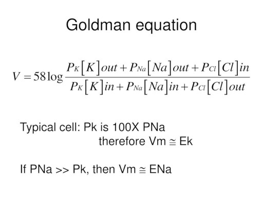 Potassium and Chloride ChannelsIn addition to active pumping, there are also passive channels that simply allow ions to travel across the cell membrane. Examples of these include passive potassium and chloride conductances. Ions that can freely diffuse across the membrane will arrange themselves according to voltage and concentration gradients. When there are already gradients set up by an active sodium pump, the total effect of other ions on the membrane potential is given by the Goldman equation, also known as the Goldman-Huxley-Katz equation or GHK.