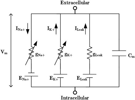 Hodgkin-Huxley EquationsThe Hodgkin-Huxley equations model the membrane potential of a neuron, based on its conductances. They begin with an electrical model because it conveniently represents the currents.
