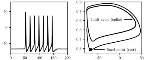 The dynamic of the Hodgkin-Huxley equation is four dimensional and difficult to visualize that way. The figure shows the phase plane reduced to two dimensions. We'll talk about ways of simplifying the equations in the section on model neurons. An important concept in modeling is preserving the "essential behavior", and what is essential depends somewhat on the model, however in the case of neurons the spiking behavior can certainly be considered essential, and there are a number of computationally accessible ways to accomplish it.
