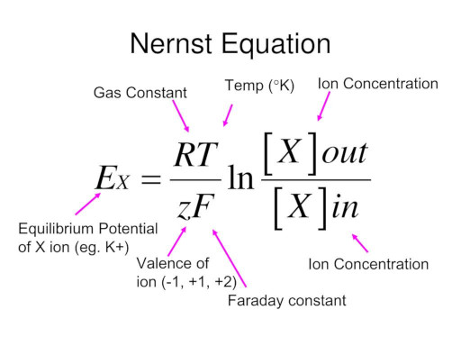 For monovalent cations like sodium and potassium this works out to V (mV) = 58 log [Cout]/[Cin] where V is the equilibrium potential and C is the ion concentration. The equilibrium potential is temperature dependent, but in biological systems the temperature is carefully regulated and consistent.