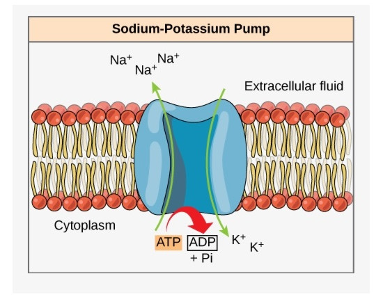 In most human brain tissue the sodium pump is coupled to a potassium pump, that shuttles potassium ions the other way, from outside the cell to inside. Each cycle of the coupled sodium-potassium pump sends three sodium ions out, and allows two potassium ions in (this occurs at the expense of one energy-providing ATP molecule). The net result is still an efflux of positive charge. This process of shuttling ions back and forth in an energy-driven manner is called active transport.