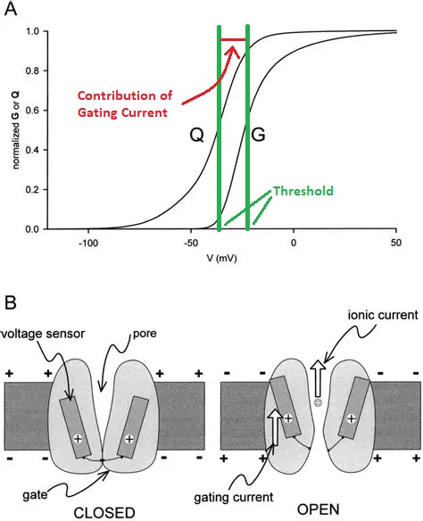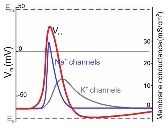 The action potential (commonly called a "spike", when the neuron "fires") is enabled by a voltage dependent sodium channel, that only opens up when the membrane potential reaches a threshold value. The threshold value is usually more positive than the resting potential. The resting potential is typically in the range of -80 to -50 mV, while the threshold is typically in the range of -50 to -20 mV. Sometimes there is a small contribution to the threshold from charged atoms within the channel, this contribution is called a "gating current" and it can be experimentally separated from the ion current. The figure shows a voltage gated sodium conductance.