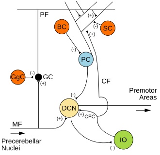 The cerebellum gets involved in eye movements in a number of ways. The vestibulo-ocular reflex is probably the best studied, but each of the degrees of oculomotor freedom has a pathway through the cerebellum, and the cerebellum is vital for keeping the eyes on target. (figure - cerebellar pathways) The two main areas of the cerebellum involved in eye movements are the vermis and the flocculus, portions of the "medio-posterior cerebellum" including lobules VIc and VII. These areas connect with the oculomotor control system in the brainstem, including specifically the pause neurons in the nucleus prepositus raphe. The fastigial oculomotor region (FOR) in the caudal fastigial nucleus fine tunes the accuracy of horizontal saccades and contributes to smooth pursuit movements.Systemic PathwaysEach degree of oculomotor freedom has a pathway through the cerebellum.(figure - VOR) The two main areas of the cerebellum involved in eye movements are the vermis and the flocculus, portions of the "medio-posterior cerebellum" including lobules VIc and VII. These areas connect with the oculomotor control system in the brainstem, including specifically the pause neurons in the nucleus raphe prepositus.Architecture of the CerebellumThe cerebellar circuits related to eye movements are organized like control systems in the engineering sense. There are two main inputs to the cerebellum, the mossy fibers and the climbing fibers. The output from the cerebellum comes from the Purkinje cells. Inside the cerebellum is a very simple arrangement of neurons with behaviors that are mostly pretty well understood by now, although much is still being learned.![]() The figure shows the overall internal architecture of the cerebellum. Mossy fibers enter from the precerebellar nuclei, and branch to connect with granule cells and Golgi cells in the specialized "dendritic claw" synapses, and with the deep cerebellar nuclei (both connections are excitatory). Each mossy fiber connects with about 50 granule cells. In turn, the deep cerebellar nuclei are also systemic outputs (they receive inhibitory inputs from the Purkinje cells) and project to premotor areas (mostly in the brainstem). The climbing fibers originate from the inferior olive, and branch to connect with the deep cerebellar nuclei and the dendrites of Purkinje cells. The cerebellar cortex therefore engages two other large structures, the deep cerebellar nuclei and the inferior olive.![]() Much is still being learned about the cerebellum, even though it is one of the best studied areas in the brain. For example, it was previously thought that Golgi cells performed a smooth integration along the dendrites, but now it is clear they have voltage dependent calcium conductances and exhibit dendritic mini-spikes. Similarly it was once thought that Golgi cells were the only neurons that inhibit granule cells, but now it has been discovered that Purkinje cells directly inhibit granule cells in some specialized areas of the cerebellum, including those related to eye movements and vestibular function (Guo et al 2018). Golgi cells do not synapse directly onto Purkinje cells, that we know of - only onto granule cells via the dendritic claw synapses associated with the mossy fiber glomeruli.Next: Cerebral Cortex |