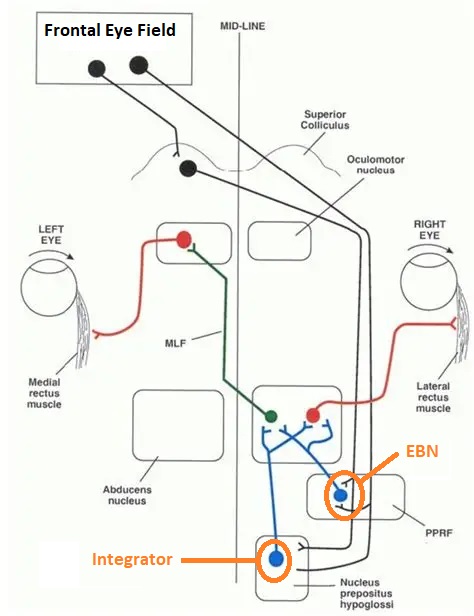 It is vital to understand the role of the integrator in the brainstem oculomotor system (Goldman et al 2009). Many signals related to the eyes arrive in the form of velocities, for example the vestibular systems issues velocity information rather than position information. These velocities somehow need to be converted into eye positions, because gaze is usually target-centric. Even the saccade-generating burst neurons in the PPRF encode velocity, some of them encode saccade amplitude with the duration of the signal and saccade velocity with the spike rate within the signal.