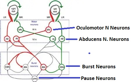 There are excitatory and inhibitory burst neurons driving saccades. The excitatory burst neurons excite the abducens motor neurons on the same side (ipsilateral), and the oculomotor neurons driving the medial rectus muscle on the opposite side (contralaterally). At the same time, they connect with inhibitory burst neurons on the opposite side, which inhibit the abducens motor neurons contralaterally, and the medial rectus ipsilaterally. These connections are shown in the diagram below. The burst neurons are located in the paramedian pontine reticular formation (PPRF), and the pause neurons are nearby in the nucleus raphe interpositus. EBNs from the PPRF project to the contralateral IBN's located in the area of the nucleus paragigantocellularis. The neurons labeled INT are the non-cholinergic abducens interneurons that cross the midline to feed the contralateral medial rectus motor neurons. Not shown are the connections with the cerebellum.