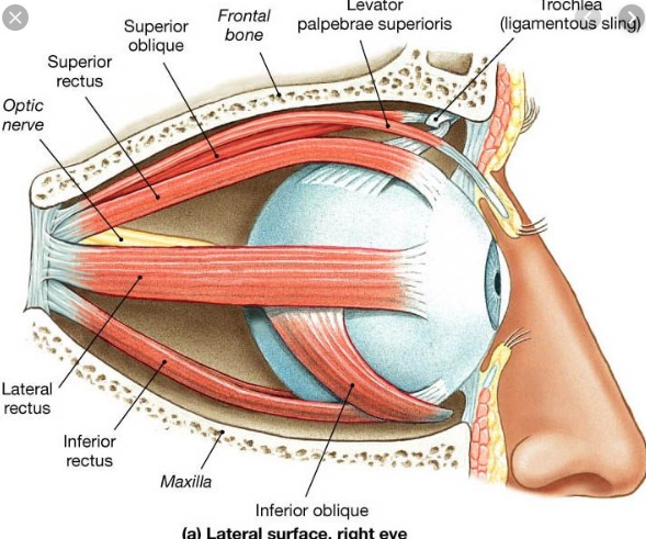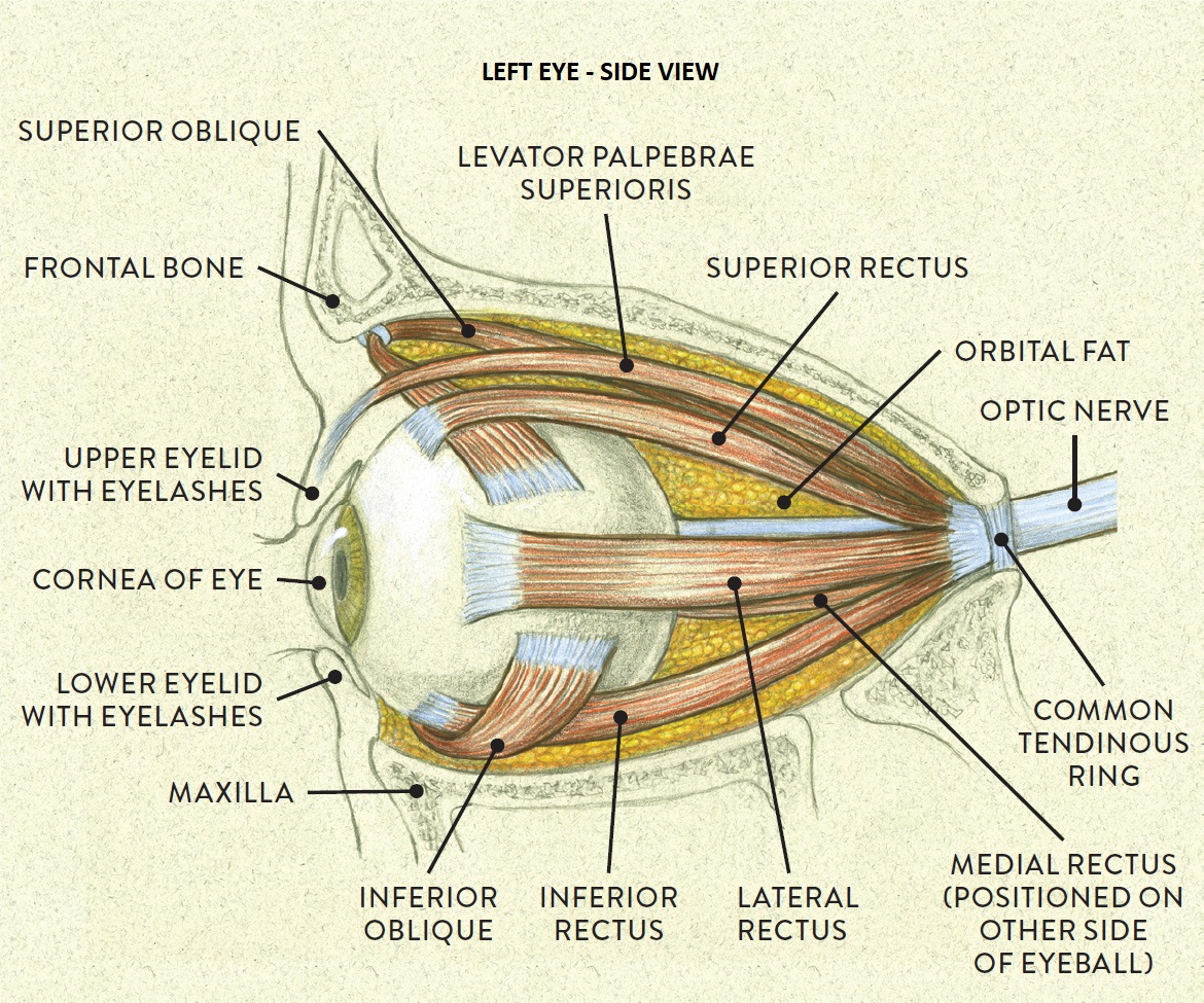 Eyes and Eye MusclesThere are six main muscles that move the eye in its socket, and several others related to the eyelid, pupil, and lens. Eye movements along the horizontal and vertical axes are organized by the rectus muscles, which are arranged into push-pull pairs. Each muscle maintains a low level of tonic activity even during fixation, to keep the eye stable and avoid drift. The figure below shows the organization of the muscles in the right and left eyes.