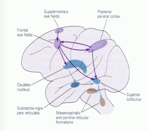 To begin with, let's get the mile-high view of the oculomotor system, to help put things in context. The overall organization of the oculomotor system in humans is shown below. In addition to the cortical areas shown below there is also an eye field in the anterior cingulate cortex, that communicates with the frontal and supplementary eye fields. The second figure shows two different sets of pathways through the pontine nuclei, which are part of the cerebellar circuitry. We'll look at the anatomy more closely on subsequent pages.