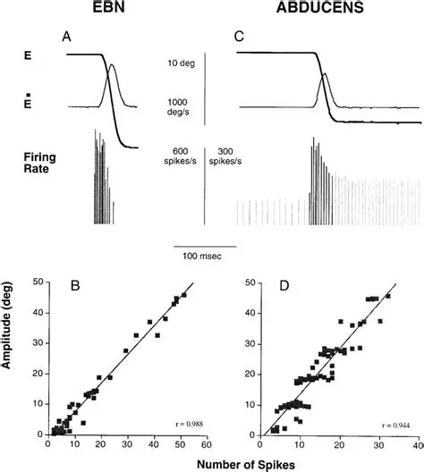 The firing pattern of an abducens motor neuron and an excitatory burst neuron relative to a saccade is shown in the figure below. Note that the burst occurs slightly before the saccade, and note that the abducens motoneuron retains a new tonic firing level after the saccade.