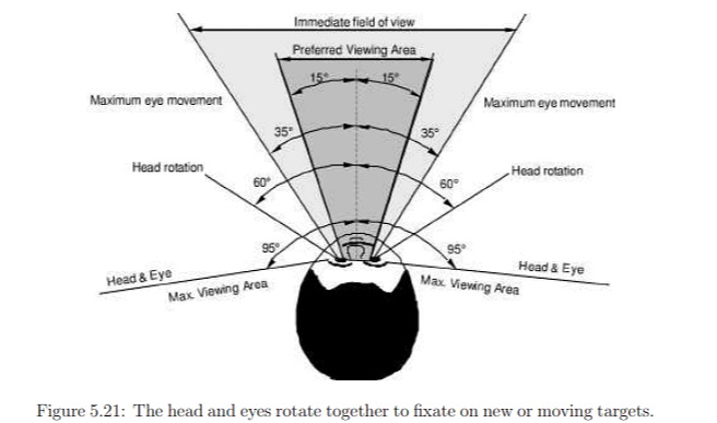 The range of eye movements is approximately aligned with the "immediate field of view", as shown in the figure. Targets outside of this range tend to evoke more complicated orienting movements involving the head and body. Some of these movements are organized by the superior colliculus, and transmitted through descending fibers that target the cervical and spinal motor pathways.