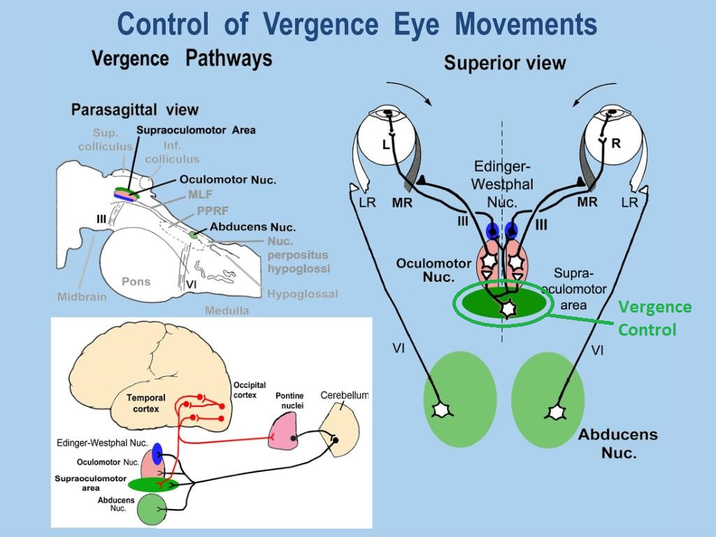Vergence MovementsIn a vergence movement, both eyes move towards the midline, or away from the midline. Vergence movements integrate with both saccades and smooth pursuit movements. The vergence pathways integrate with the horizontal controls at the level of the supraoptic nucleus and the oculomotor nuclei.