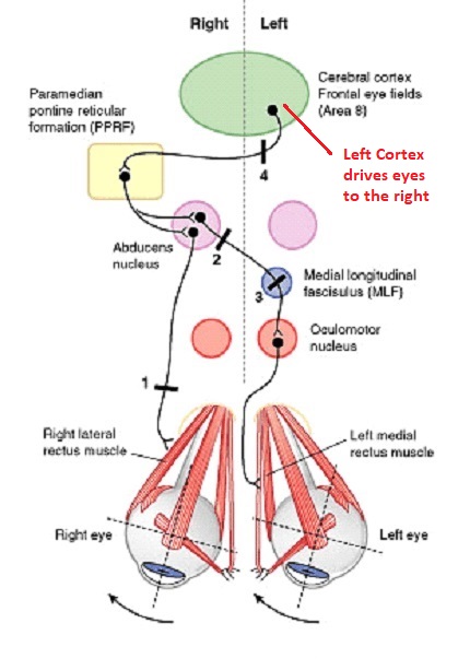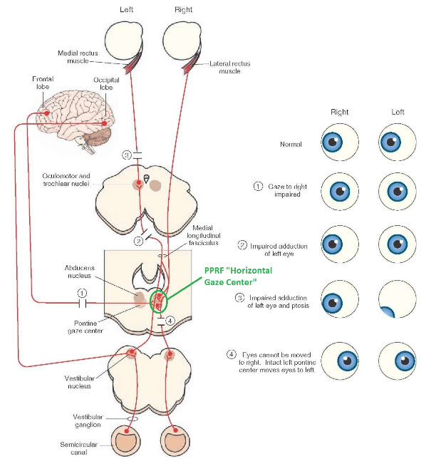 The eyes have "focus", both horizontally and vertically, and in depth. The horizontal and vertical foci are often conceived in terms of "gaze centers". When organized this way, the horizontal gaze center is in the paramedian pontine reticular formation (PPRF), and the vertical gaze center is in the rostral interstitial nucleus of the medial longitudinal fasciculus (riMLF). As you can see in the figure, horizontal saccades are primarily driven by the lateral rectus muscle on the abducting side, and its accompanying neural circuitry.