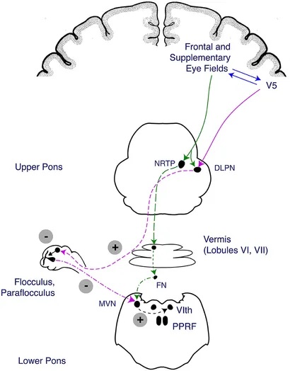 The NRTP then sends fibers to the fastigial nucleus of the cerebellum, whereas the DLPN targets the vermis which connects with the flocculus and paraflocculus. Both systems then converge onto the medial vestibular nucleus. The cerebellar systems are needed for the prediction phase of the smooth pursuit movement. The predictive systems engage rapidly after initiation.