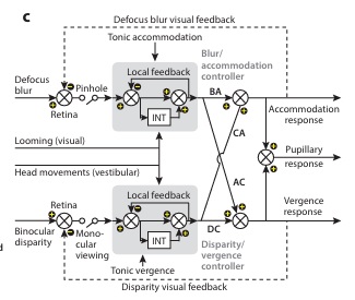 Vergence debatably has its own neural integrator, although there are some reports that neurons in the rostral superior colliculus may perform at least a portion of the integrative function. The figure shows a proposed model handling both slow and fast aspects of vergence (Quinet et al 2025).