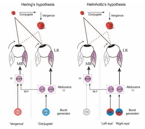 There are generally two hypotheses for organizing vergence, championed by Ewald Hering and Hermann von Helmholtz respectively. In the Hering model, target position is encoded by a saccade channel controlling the abducens motoneurons, and then "corrected by" a vergence channel that affects only the motoneurons in the oculomotor nucleus controlling the medial rectus muscle. In the Helmholtz model, each eye is controlled independently. Current evidence favors a mixed model, where vergence position and velocity commands are derived from a 3-dimensional superior colliculus and then decoded into the relevant oculomotor components. There is definitely complexity in this issue and it remains a subject of intensive research.