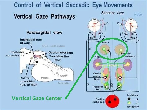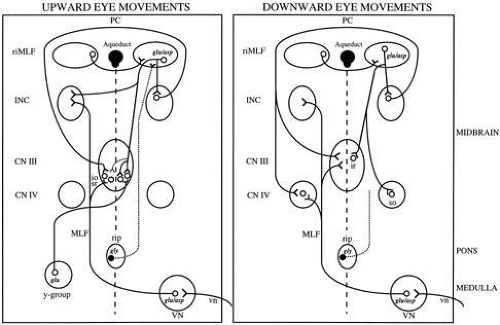 In the vertical eye movement system, the rostral interstitial nucleus of the medial longitudinal fasciculus takes the place of the PPRF burst neurons, and the interstitial nucleus of Cajal takes the place of the neural integrator.