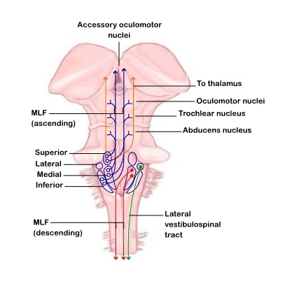 From the medial vestibular nucleus, outgoing fibers innervate the NPH, and the oculomotor nuclei directly. The abducens, trochlear, and oculomotor nucleus are all innervated directly by the MVN (the MVN is also known as the nucleus of Schwalbe). The MVN is divided into three parts, a parvocellular region most medially consisting of densely packed small neurons, a ventral magnocellular area providing the main output, and a caudal region with heterogeneous cytoarchitectonics. In primates, inputs to the MVN originate from the ipsilateral semicircular canals and otolith organs and the ipsilateral interstitial nucleus of Cajal, and contralaterally from the spinal cord. Bilateral inputs originate from other vestibular nuclei, the NPH, pontine and medullary reticular formation, the cerebellum, and the cerebral cortex. Commissural fibers interconnect the MVN's bilaterally.