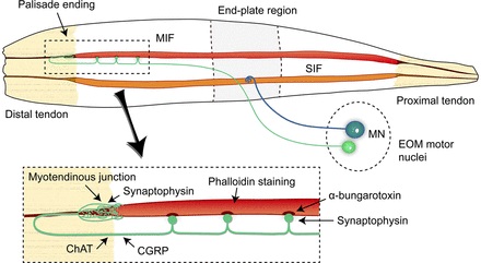 In humans and primates, there are specialized structures called "palisade endings" that make up the majority of proprioceptive input from the eye muscles. The palisade endings are about halfway between ordinary muscle spindles and Golgi tendon organs. They connect mostly with the smoother slower non-twitchy muscles, and as such they primarily provide information related to eye position. Recent data indicate that the cell bodies giving rise to palisade endings are located in the oculomotor nuclei, interspersed with the motoneurons feeding the slower non-twitchy eye muscles. The motor neurons are cholinergic whereas the PE cells are round and calretinin positive (Leinbacher 2012).