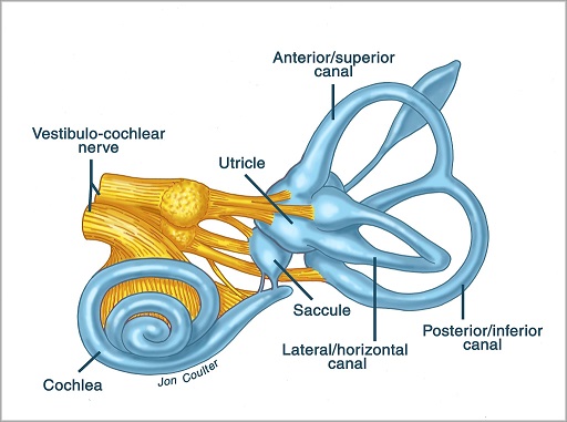 The horizontal semicircular canal is approximately aligned with the horizontal axis of the head and therefore the horizontal axis of the eyes. The superior and inferior canals detect rotation of the head in the sagittal and frontal planes, and they're not "perfectly" vertical, such a motion would engage both of these canals. The primary sensory neurons for the semicircular canals are in Scarpa's ganglion, which is in the internal auditory canal where the superior and inferior divisions of the vestibular nerve converge. These are bipolar neurons, the sensory side (dendrite) travels through the vestibular nerve to connect with the hair cells in the labyrinths, and the motor side (axon) connects with the one of the four subdivisions of the vestibular nucleus.