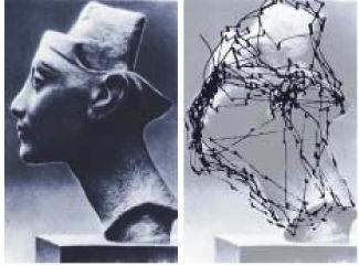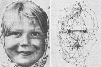 At any given time there are multiple visual targets, both those that are present and those that are being attended. When a new target is presented, the brain tends to search it, executing exploratory saccades to different interesting areas in the target. Typically the fixation period is brief, lasting about a third of a second. An example of visual search is shown below.