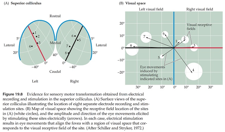 While the superficial layers of the SC are retinotopic and process visual information, the deeper layers help coordinate motor behavior related to target locations, like approach and avoidance. The SC also receives a projection from its cousin the inferior colliculus, which helps align the map of auditory space with the map of visual space. We'll take a close look at map alignment later on these pages.
