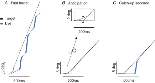 Humans have many strategies available for exploring the environment and targeting stationary or moving objects with eye movements. Saccades and pursuit movements are different outcomes of the same decision process. Some possible interactions of saccades and pursuit are shown in the figure.