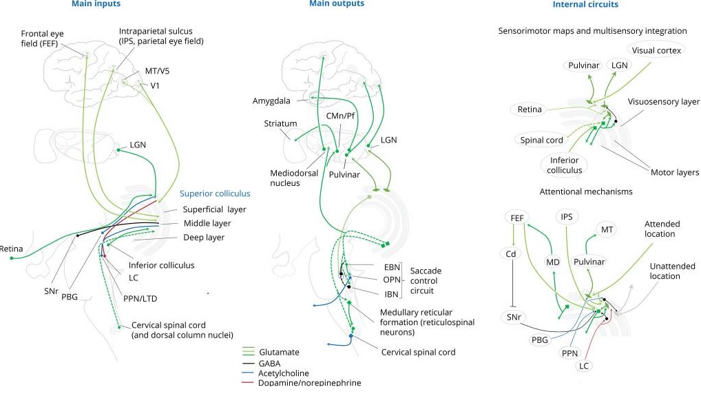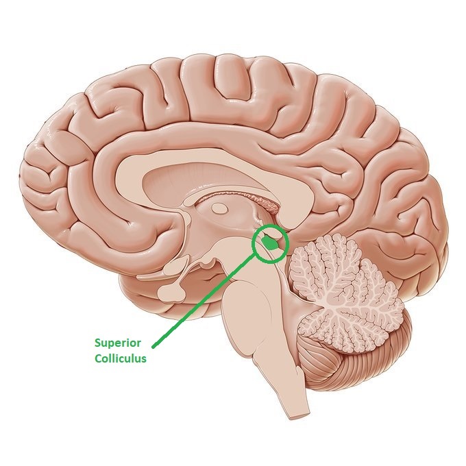 Anatomically, the rostral pole of the SC contains a map of the contralateral fovea, and it contains fixation neurons, that send a monosynaptic excitatory input to the pause neurons in the NRI. Whereas, the caudal portions of the SC contains neurons that discharge before saccades and project to burst neurons which in turn activate EBN's and IBN's (Shinoda et al 2019). Inhibitory burst neurons also inhibit contralateral pause neurons, providing a disynaptic pathway that helps trigger saccades.