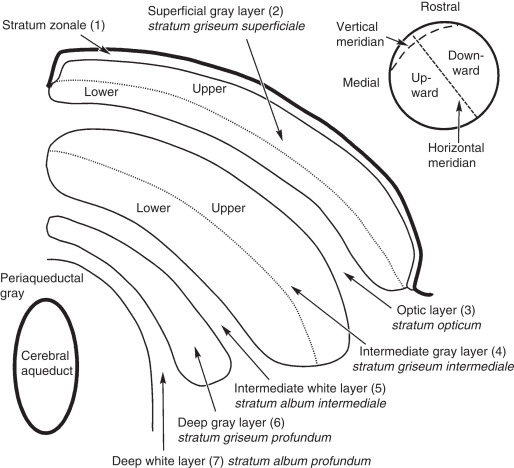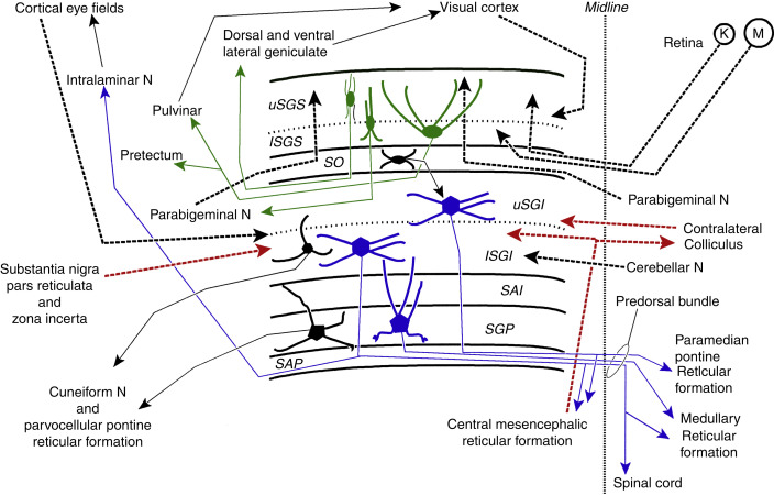 Anatomical OrganizationIt is generally agreed that the superior colliculus has three functional layers, a superficial layer that receives visual input, and two deeper layers (called intermediate and deep) that trigger orienting movements - not just of the eyes, but also of the head and body. Sometimes it is possible to elicit approach or avoidance behaviors as well, by electrically stimulating the superior colliculus. In this figure, the superficial layer consists of the stratum zonale, stratum griseum superficialis, and stratum opticum. The intermediate layer consists of the SGI and SAI, and the deep layer consists of the SGP and SAP.