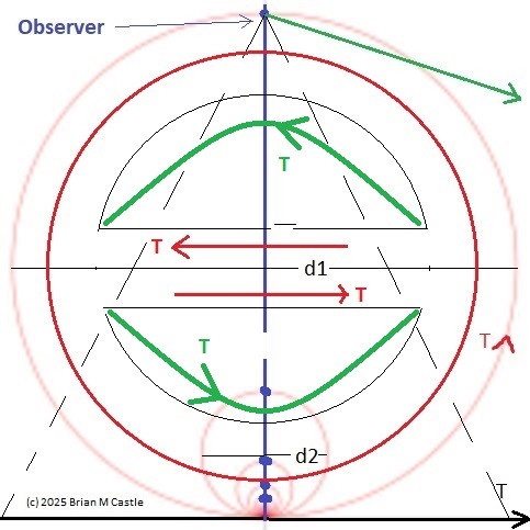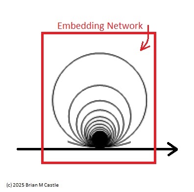 From a machine learning standpoint, a proper embedding requires that we access both the original timeline and the compactified timeline. This allows us to "project back down" from a loop to the line segment. However when we do this, something interesting happens to the orientations. If we place an observer at the point at infinity, looking straight down at T=0, and project the compactified view back down to one linear dimension, the information travels in the correct direction along the bottom half of the circle, but it travels in the opposite direction along the top half. This results in some interesting abilities relative to the determination of causality, and it also explains the "backwards replay" observations of neural activity in areas like the prefrontal cortex and hippocampus.
