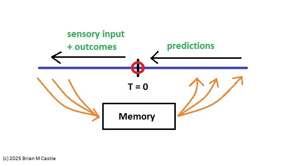 At this point in the discussion, we can look at the above figure and determine at a glance that the machine network is not compactified and doesn't have any idea of "now". And it's quite obvious that the biological network isn't quite as neatly organized as its machine counterpart, the layers are somewhat indistinct and there is all kinds of wiring that bypasses layers. However one can think about an extended timeline that's "not" compactified, and how exactly it would have to work to get information from memory into motor action. (Robots do this, but they have the benefit of a clock to synchronize the circuitry - and there is no such clock in the brain). There are models that do not require an "infinite" timeline, and a bounded timeline gives us a convenient way of understanding the roles of brain structures like the hippocampus and the prefrontal cortex, that operate at T < 0 and T > 0 respectively. There is considerable evidence for a "grid" of temporal relationships in the human brain, that operates very much like the range of spatial frequencies in the visual system (Umbach et al 2020, Aghajan et al 2023, Nolan 2025). This mapping in humans lives in the area around the hippocampus, in the entorhinal cortex, perirhinal cortex, parahippocampal cortex, and internally to the hippocampus, in the subiculum and the fields of the cornu ammonis. An open question is whether such structures map activity onto the timeline, or extend the timeline, or both.