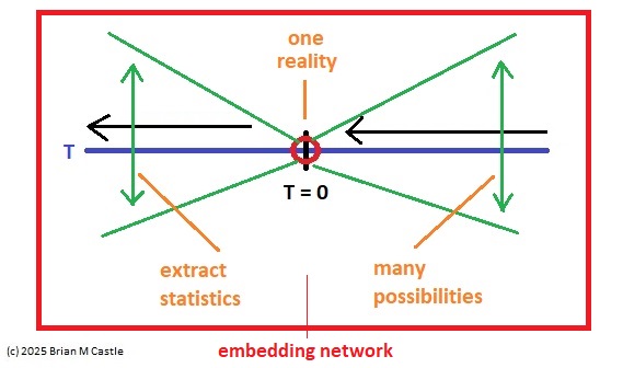 We are predicting the network activity in the neighborhood of T=0, from the vantage point of the compactified points at infinity (the distance between these points and the linear origin "now" represents the inherent delays of transmission through the filter). While the timeline is directional on the basis of genetically programmed brain wiring, the embedding network is inherently non-directional. When this network organizes itself, it will be driven by the causal character of events in the environment. The flow of time in the representation space will be from future to past, and the same orientation will apply to the induced internal events. This provides us with an immediate link to the "directed acyclic graphs" that are so important in causal analysis and causal modeling (meaning, the elaboration of motor behavior).