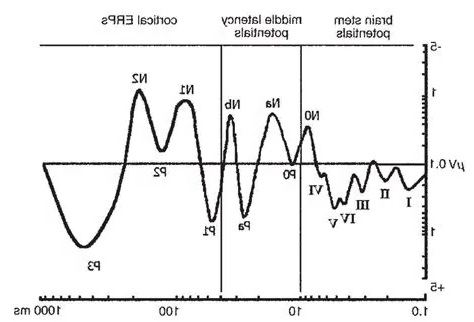 Here is the same thing for the auditory system, which has many identifiable markers, and the brainstem auditory evoked response (BAER) is an important clinical diagnostic tool. A similar sequence of evoked potentials exists in the visual system, and we'll look at it in detail on subsequent pages.