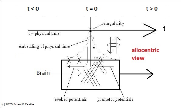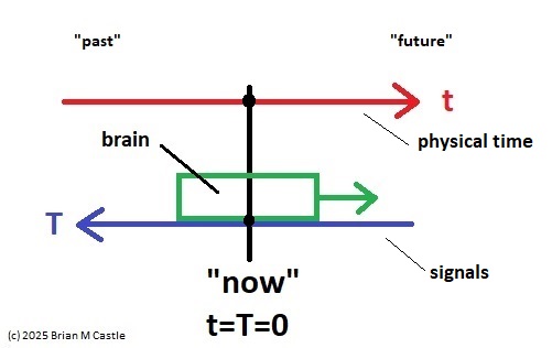 Evoked potentials occur after an event, and premotor potentials occur before an event. Combining and unifying these into a single map we can create a "time line" centered on the point "now", which we'll call t=0 (since it occurs "now" in physical time). And, we will explicitly map physical time into a representation space that is defined by the inherent architecture of the brain's neural networks. To distinguish the representation space from physical time, we'll call the representation big T, as distinct from physical time which is little t. This arrangement is shown in the figure. Here, the brain is a window moving through physical time, and note that the representation space T has the opposite orientation from physical time t. This is because T uses an egocentric reference frame, whereas t uses an allocentric reference frame. In the egocentric reference frame, the brain remains stationary and the signals move "through" it as shown. To align these two reference frames, we define "now" as t=T=0.