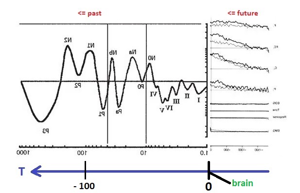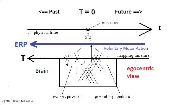 In the earlier diagram, event related mapping occurs within the window shown in green, which advances along with physical time. However information relative to the point "now" moves in the opposite direction. Premotor potentials begin in the "future", and event related potentials map "past" environmental activity. T is oriented so it aligns with the time course of event related potentials. ERP's move in the same direction as T. T and t move in opposite directions (a time of T=-1 in the past means that physical time has already advanced to t=+1). T moves from future to past.
