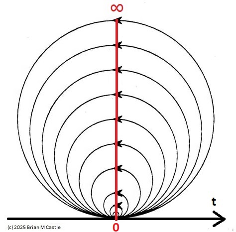 To emphasize, the radius of a loop models the length of a reflex arc. A reflex arc is viewed in the broadest possible terms, as a directional signal flow that can occur at any level of resolution. There are reflex arcs in the ordinary (anatomical and electrophysiological) sense, and there are also reflex arcs at the molecular level, and at the level of entire neural networks and subsystems. These loops have two things in common - they all intersect t=0 "now", and their points at infinity all line up in the compactified space.