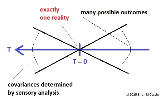 The idea in the earring, is that predictions are matched with outcomes, at many different scales and at many different resolutions. If we really wanted to trace the path of an action potential through the network, we would end up with a very nonlinear Kalman filter that would have to be described in terms of Volterra kernels and beyond, and such an exercise while interesting is not necessarily useful. But we can loosely conceive for example, a situation in which a voluntary motor action is staged along the timeline and then modified by ongoing sensory information. At the far right of the timeline, there are many possibilities for the actual outcome, but as we move inward, sensory conditions are processed and the range of possibilities is narrowed, until at T=0 one sensorimotor reality is materialized.