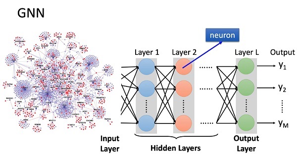 In spite of the complex vocabulary generated by a combination of neuroscience and machine learning, the basic idea behind a graph neural network is straightforward. We want to represent the graph on the left, in the neural network on the right.
