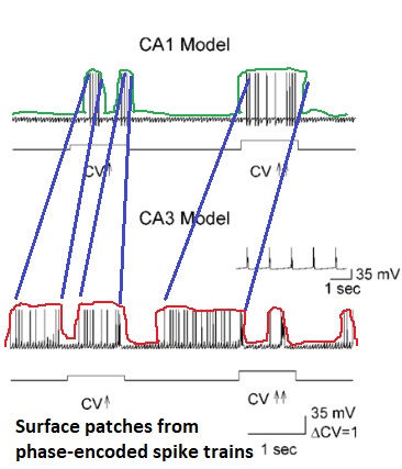 Information geometry is the science of separability. It's also the mathematics of representation, and parametrization. Separability is a big deal in machine learning. Perceptrons can perform linear separability, and related architectures can handle some nonlinear separability, but what is it exactly that confers separability? Data scientists use tricks like projecting the data up into a higher dimension, so axes that might not have been predefined become visible. If we had a perfect correlation engine so we didn't have to know any categories or relationships in advance, how can we best represent the data so that related information is clustered together, and unrelated information is separable? And how can we then zoom in, in such a way that the clustered information becomes separable too? One of the interesting things about the kind of phase encoding that happens in the hippocampus, is that the resulting spike trains end up resembling little surfaces. If one were to draw a curve around the shape of the spike train, and then combine several such curves, one would obtain a surface. That is to say, a small "patch" of surface - a mini-surface.