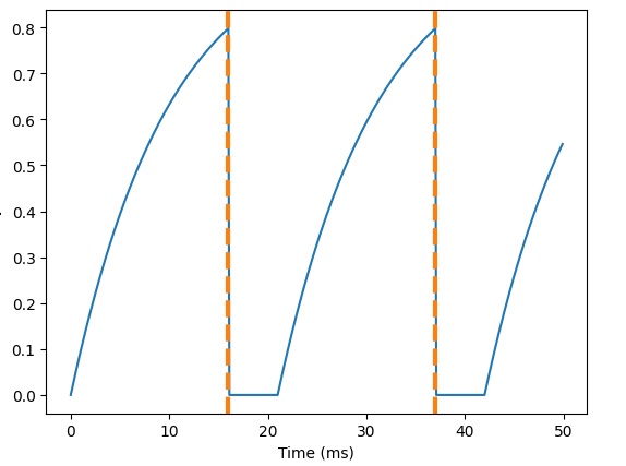 eqs = ''' dv/dt = (I-v)/tau : 1 I : 1 tau : second ''' G = NeuronGroup(3, eqs, threshold='v>1', reset='v = 0', method='exact') G.I = [2, 0, 0] G.tau = [10, 100, 100]*ms