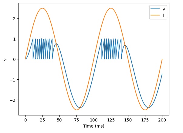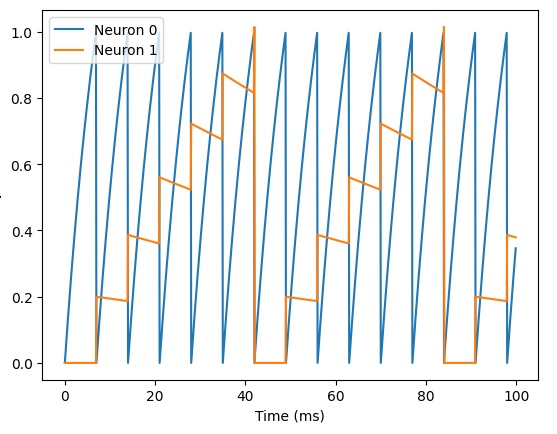 plot(M.t/ms, M.v[0], label='Neuron 0') plot(M.t/ms, M.v[1], label='Neuron 1') plot(M.t/ms, M.v[2], label='Neuron 2') xlabel('Time (ms)') ylabel('v') legend();