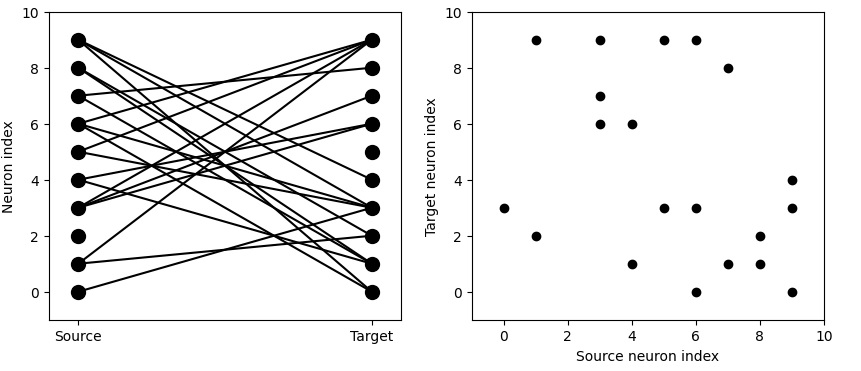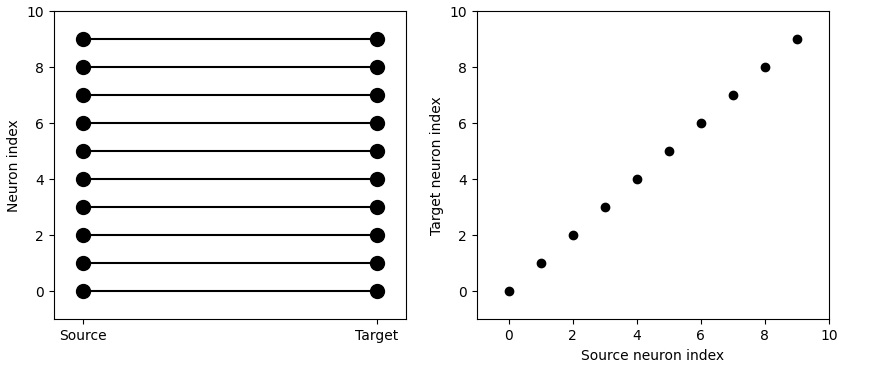 We can get very specific topography with this. We can tell Brian2 to connect neurons 1 to 1 according to their indices.