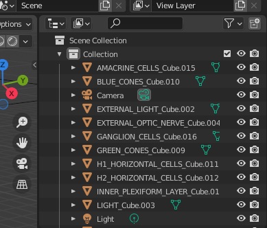Fine, done, we have two bars of light, so save the file and return to the retina. After defining the global coordinate system, we need to insert our sheets of neurons. We can do it this way: