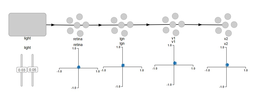 Here is what Nengo looks like. We have defined the early stages of the visual system as a feed-forward pathway. To keep it simple, we have a source of light in two dimensions, so there's only one spot of light and it's only in one position at a time. The network is set up so it "represents" the position of the stimulus. We would like to test the topography to see how well it's being maintained through the various layers.