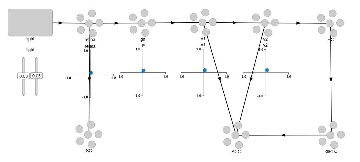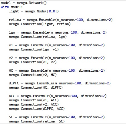 Easy, right? By default, with nothing else specified, Nengo is using leaky integrate-and-fire neurons with a membrane time constant around .01 sec. We can easily change these settings. For now, we're interested in mapping the pathways we'll need to connect into the memory system, the attention system, and the oculomotor system. We can begin by representing the superior colliculus for the oculomotor system, the anterior cingulate cortex for the attention system, and the hippocampus and prefrontal cortex for an episodic memory system.
