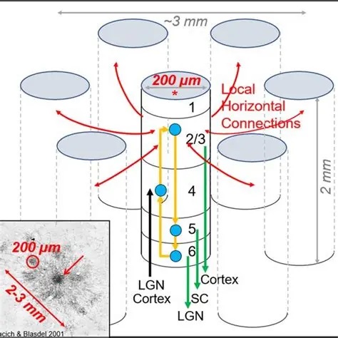 Processing modules in the cortex can have varying sizes depending on their function. For example in the visual system (discussed in the next section), the "mini-columns" are very small, they're only about 60 microns wide and contain around 100 neurons. Whereas, a processing "column" is usually definable on the order of 500 microns, containing 50 to 100 mini-columns. Depending on the vocabulary used by an author, a "hypercolumn" is either equated with a column, or is a higher order collection of columns. In the visual system, a hypercolumn is considered a collection of columns, it's about 1-2 mm wide, which is much closer to the branching size of an incoming axon from the thalamus. The actual organization of a cortical area is shown in the figure, this particular one is from the rodent vibrissal cortex, which contains large easily accessible columns that have been modeled computationally.