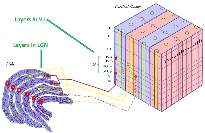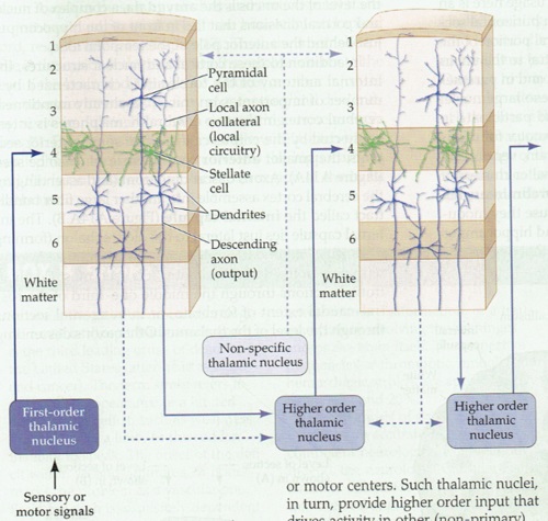 In the primary visual cortex the connection motif becomes very regular and very specific. Inputs from the thalamus arrive in layer 4, with the exception of a few koniocellular fibers from the LGN that target the blobs in the upper layers. The pyramidal cells in layer 5 project subcortically, to the basal ganglia, to the superior colliculus, and so on - whereas those in the upper layers project preferentially to other areas of visual cortex, both near and distant, and many send axons through the corpus callosum to connect with their counterparts in the contralateral hemisphere. The fusiform cells in layer 6 project back into the thalamus, so there is a loop from the thalamo-cortical relay cells going through layer 4 to these layer 6 neurons, and back to the thalamus.