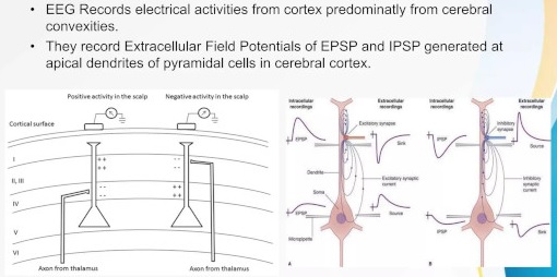 In the cerebral cortex, there are typically six identifiable layers (as shown in the figure), and there are large pyramidal neurons that are oriented vertically through the layers. The apical (vertical) dendrites from these neurons are aligned and generate large externally measurable currents. Within the cortex, such pyramidal cells cluster in layers 5 and 2/3, so the current measured externally is the sum of these activities.