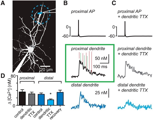 Distribution of Calcium ChannelsRiding on top of population rhythms, are the rhythmic behaviors of individual neurons. Typically (but not always), these are much faster than population oscillations. Endogenous rhythmicity is often related to voltage dependent calcium channels, and their distribution along the nerve membrane determines the areas of sensitivity and behavior. In the dendritic spines visualized earlier, calcium channels are sometimes distributed along the postsynaptic membrane and in the shafts as well, but not necessarily along the main dendrites. At other times the situation is reversed, and generally wherever the calcium channels are, is where we can start looking for rhythmic behavior. (There are other ways to achieve it, but that's a good place to start).